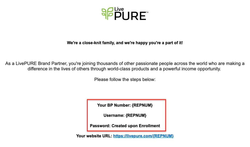 | Recibirás un correo electrónico de “Bienvenida” con el nombre de usuario (Número de Cliente o Número de Socio(a)) el cual utilizarás para iniciar sesión en livepure.com y vbo.livepure.com |