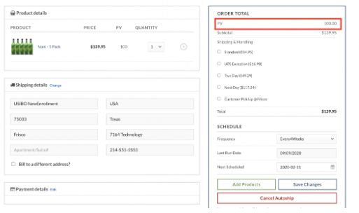 En “Mi Cuenta” > “Mis Envíos Automáticos”, haz clic en “Editar” junto a tu envío automático. El Volumen Personal (PV) del envío automático se mostrará en “Total del Pedido”.